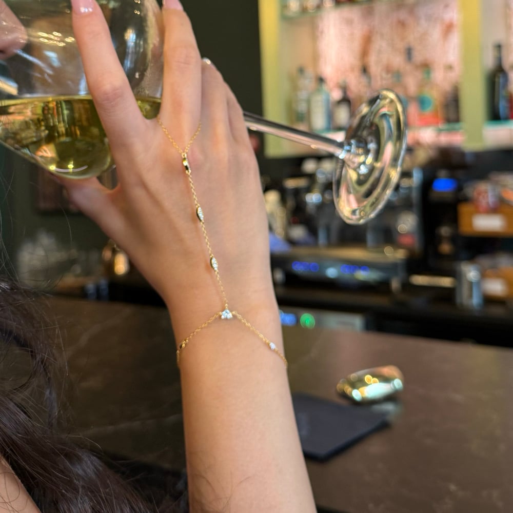 A hand chain that mirrors divine light — Divina Ray features three radiant marquise stones guiding the eye downward in perfect harmony. Subtle wrist accents complete the form, a tribute to clarity, grace, and sacred beauty.