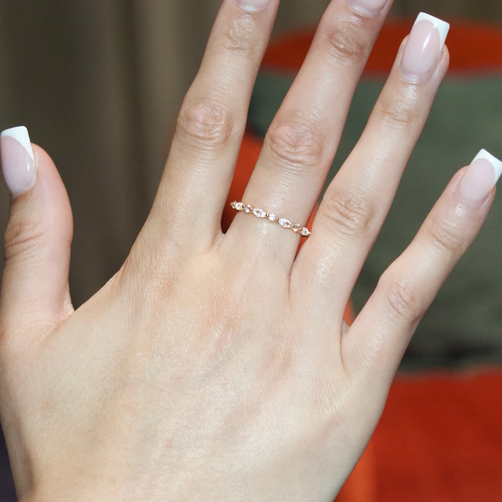 Pure geometry, divine execution — Elaris Band marries precision and grace. The contrast of marquise and round stones creates a rhythm that glows softly with every gesture — refined radiance in form.